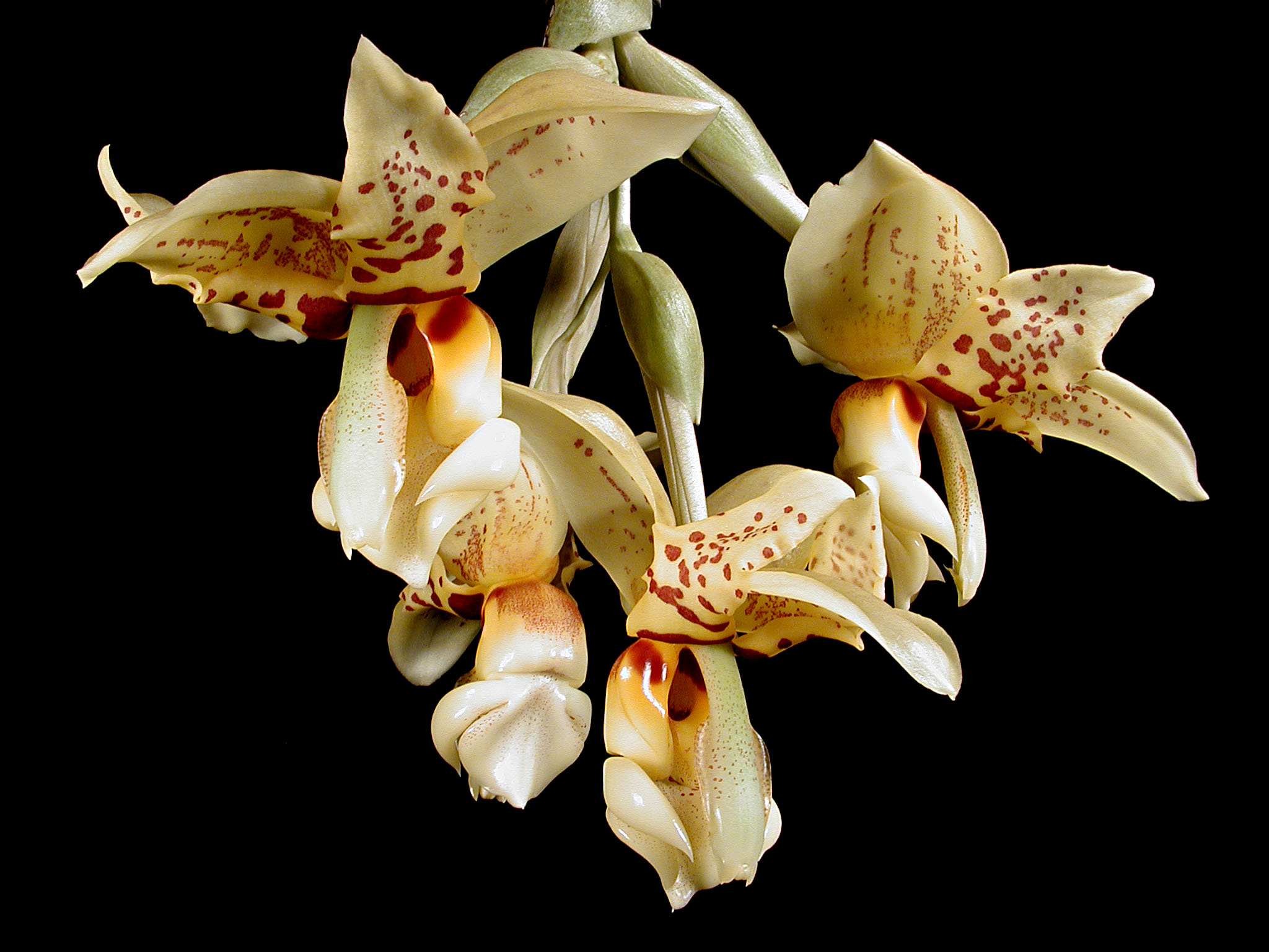 Stanhopeas and related genera have large, pleated leaves and bear incredible flowers with intricate, complex structures and mechanisms for pollination, ranging from channeled walkways for insects to buckets of a watery solution. Most have inflorescences that grow downward, so the plants must be potted in hanging baskets or similar containers. Flowers are often spicily fragrant, and although the flowers are short-lived, each plant may produce many inflorescences throughout the year. Related genera Paphinia and Peristeria grow warmer than others in this group, and may produce upright inflorescences.